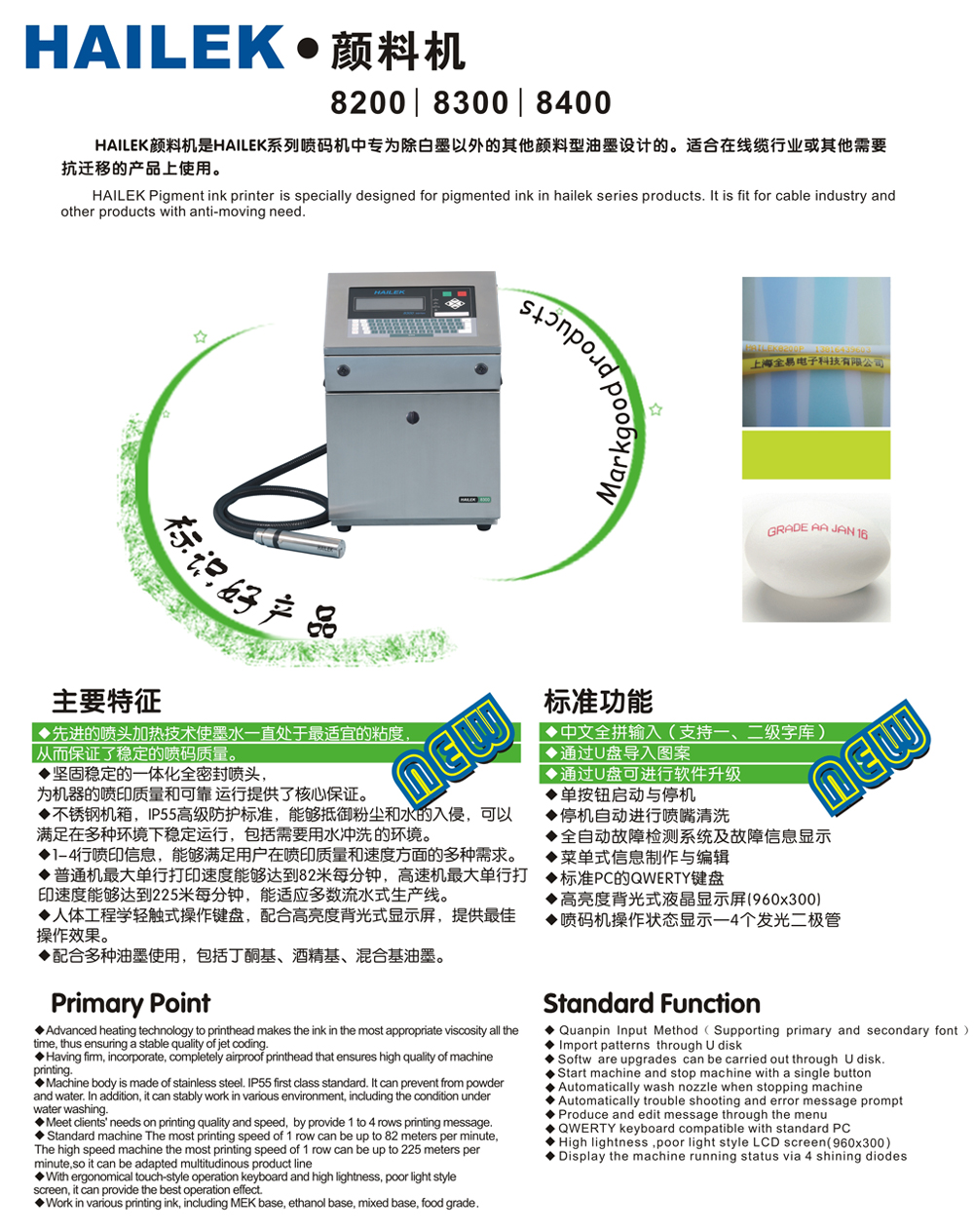 HAILEK Pigmented ink printer is akind of high speed continuous ink jet printers in hailek series products. The highest speed of printing in single row can reach at 300 meters perminute. It’s fit for any product line. It is stable and can print clearly. HAILEK High speed printer perfectly integrates speed and stability.