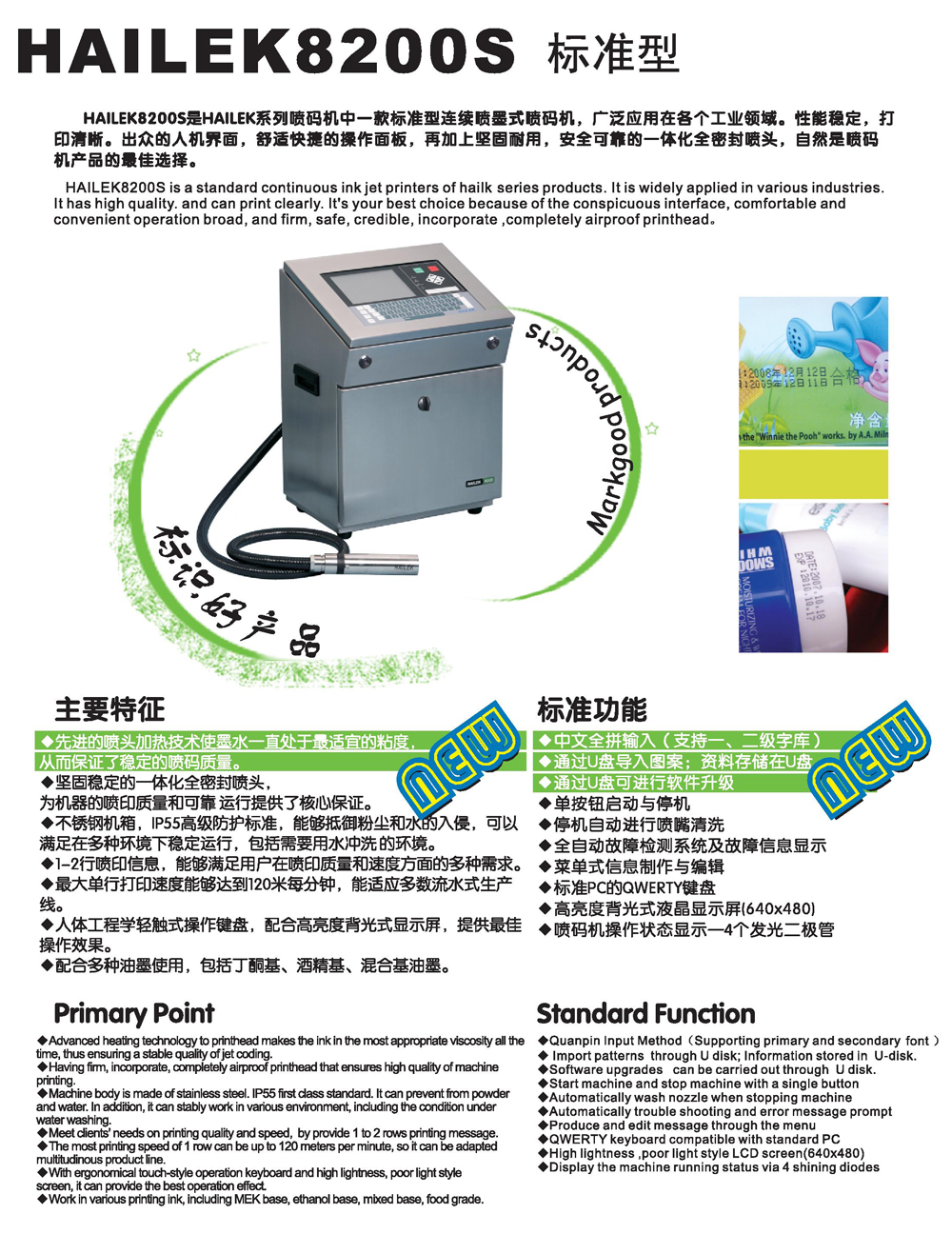 Aug, 01 2018 HAILEK8200S Standard Continuous Ink Jet Printers HAILEK8200S is a standard continuous ink jet printers of hailek series products. It is widely applied in carious indusries. It has high quality and can print clearly. Information Layout Fullwidth ? :0 Author FullName : Showcase Link : Client : Date Created : Tags: